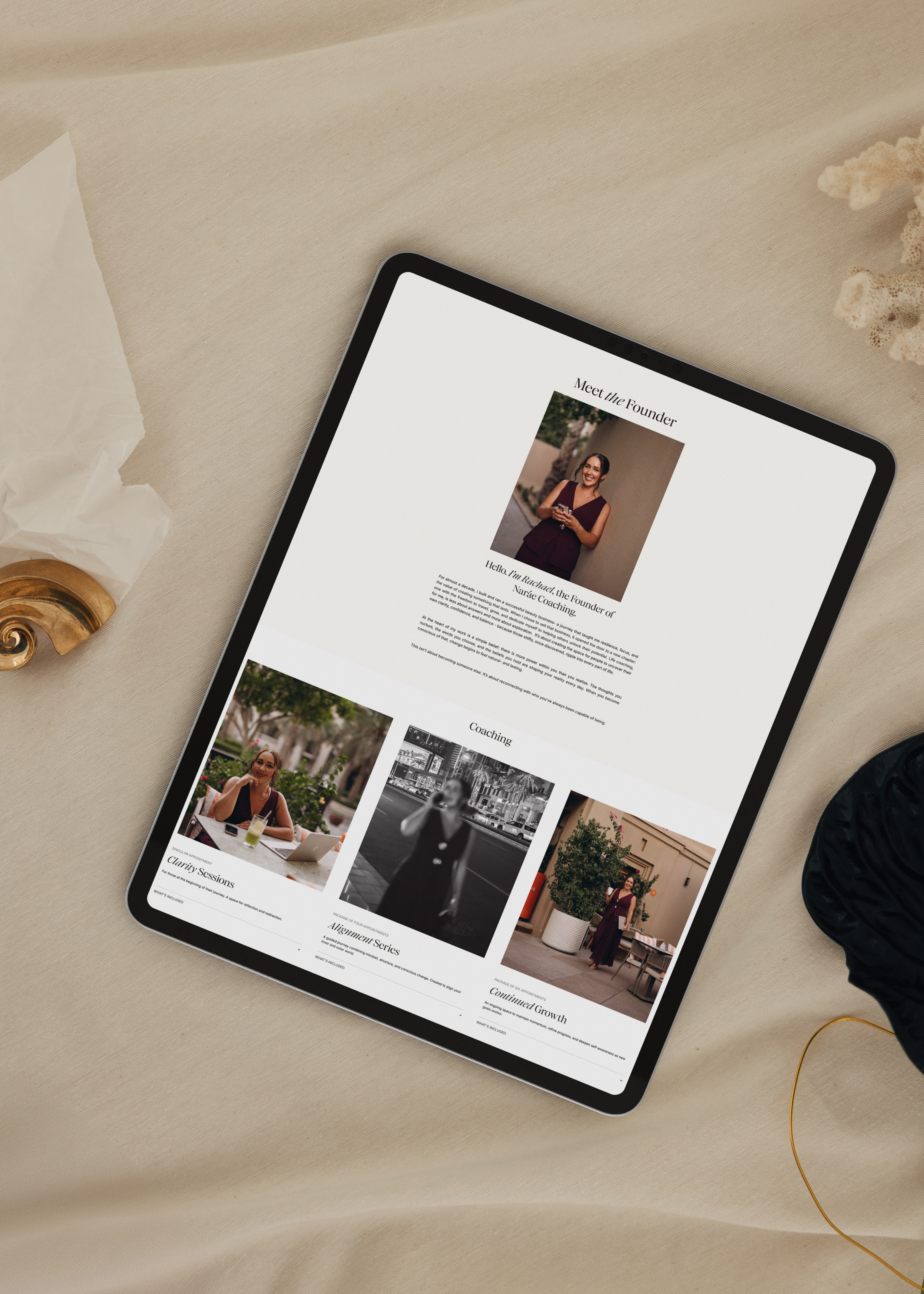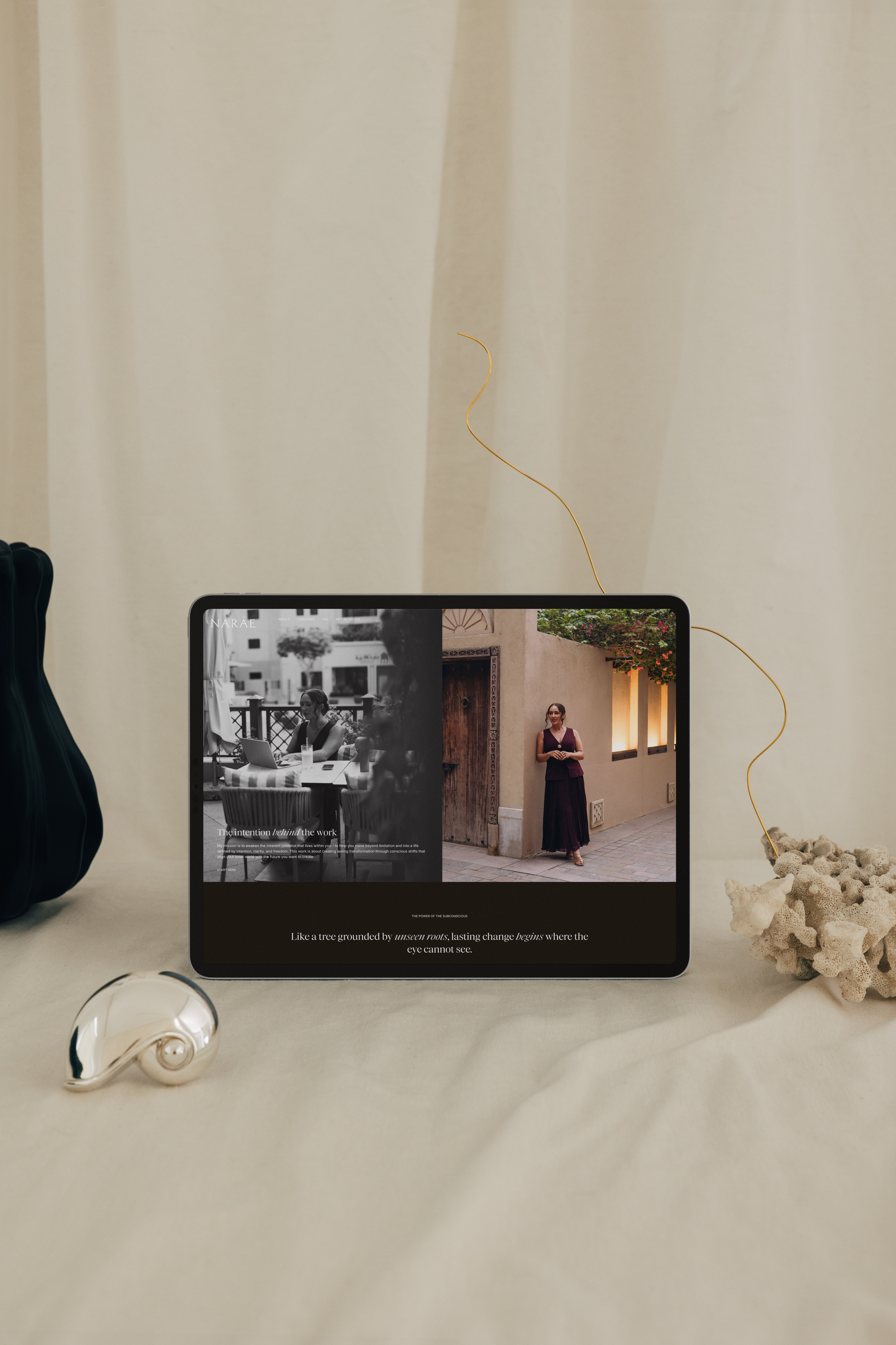 We began this journey by developing a sleek, modern logo suite with a fully custom brand mark that echoes the core values of Naráe Coaching. The primary wordmark features a timeless feminine serif font - graceful yet strong - that conveys the balance of empowerment and transformation at the heart of the brand. Paired with a clean, modern sans serif tagline with deliberate letter spacing, the design evokes calm, clarity, and professional confidence.