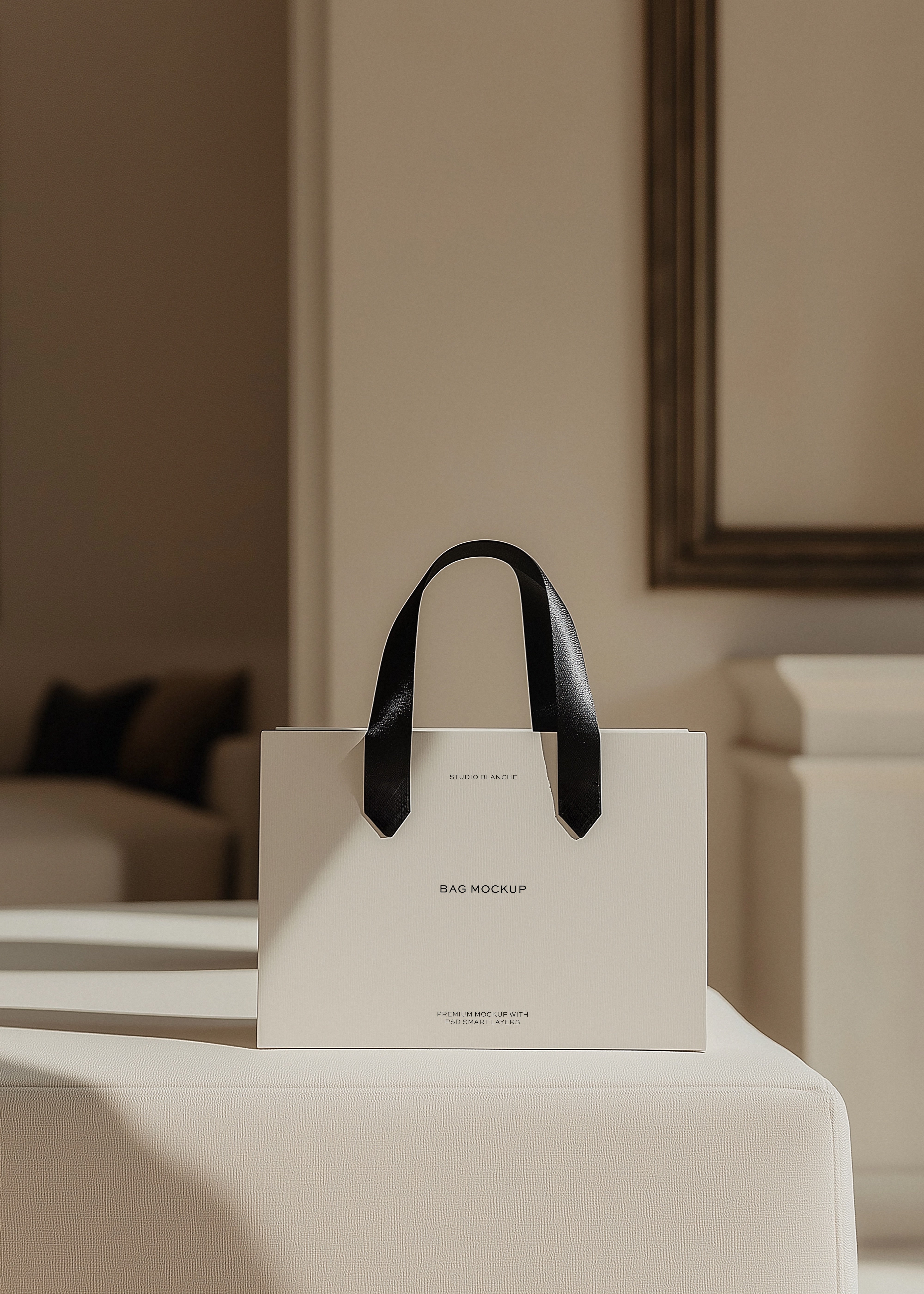 Meet our Shopping Bag Mockup, the tool that allows you to showcase your retail logo designs in a professional way. The bag is elegantly placed on a light cream sofa, allowing your design to take centre stage and truly stand out. Imagine your design on this bag, presented in the soft, inviting light of a tastefully decorated room. This mockup is all about creating that tangible, tactile connection between your design and the potential customer.