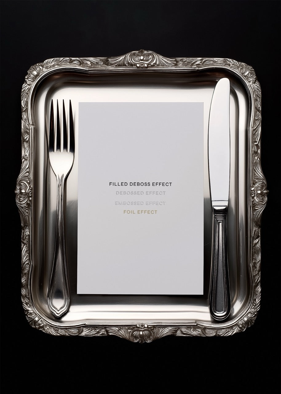 1 PSD file with smart layers including four print effects: filled deboss, blind deboss, blind emboss and gold foil.
