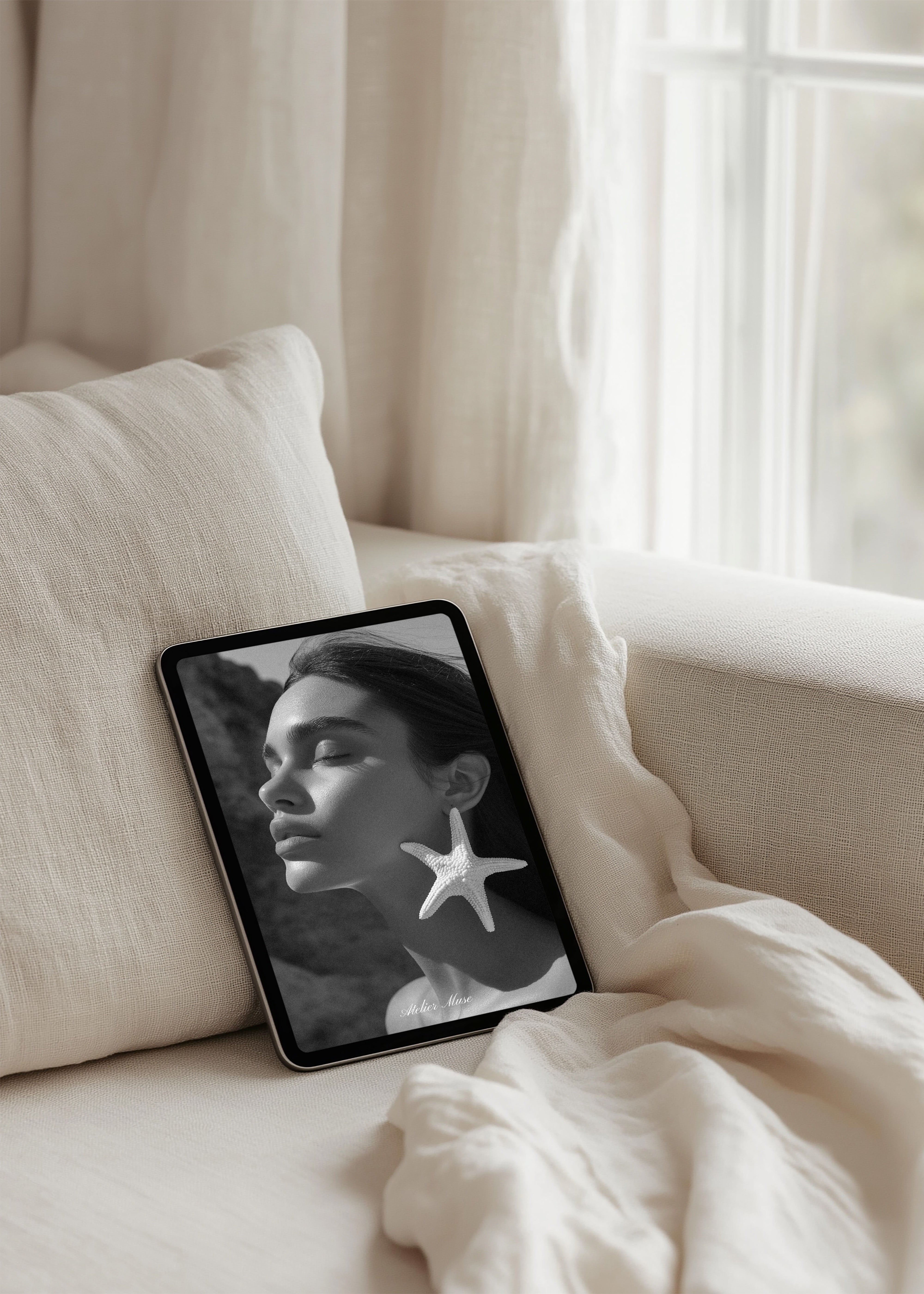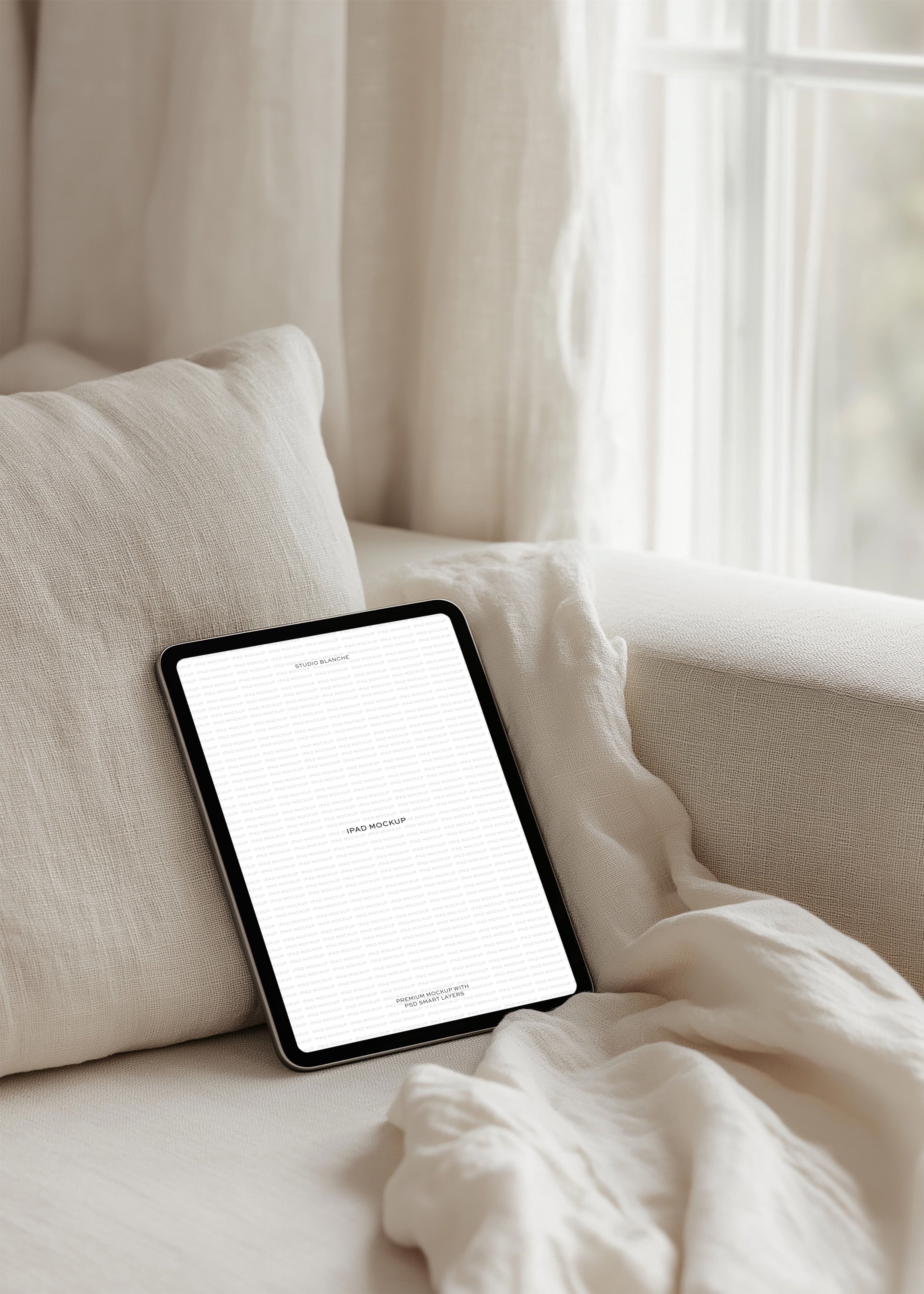 Present your designs in style with our elegant iPad Mockup. This iPad arrangement is crafted with a modern aesthetic in mind, providing the perfect canvas for your digital creations or web design. Drawing from contemporary design principles, this mockup ensures your work is the star of the show, engaging your viewers with its understated yet compelling display. Nestled against a light, contemporary interior setting, the iPad rests on a stylish cream sofa, this setup is perfect for those seeking to highlight their designs in a sophisticated and modern way.