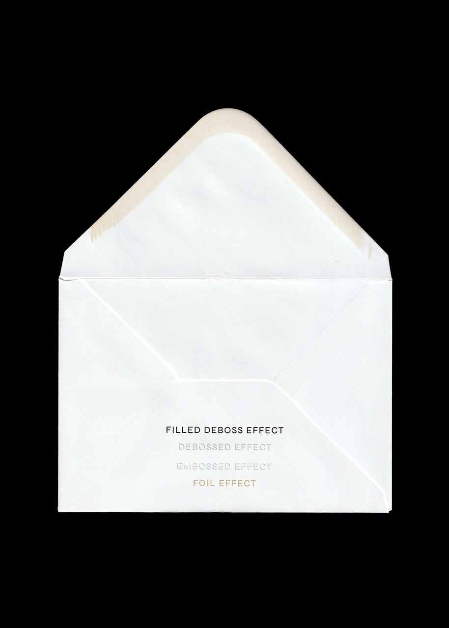 1 PSD file with smart layers including four print effects: filled deboss, blind deboss, blind emboss and gold foil.