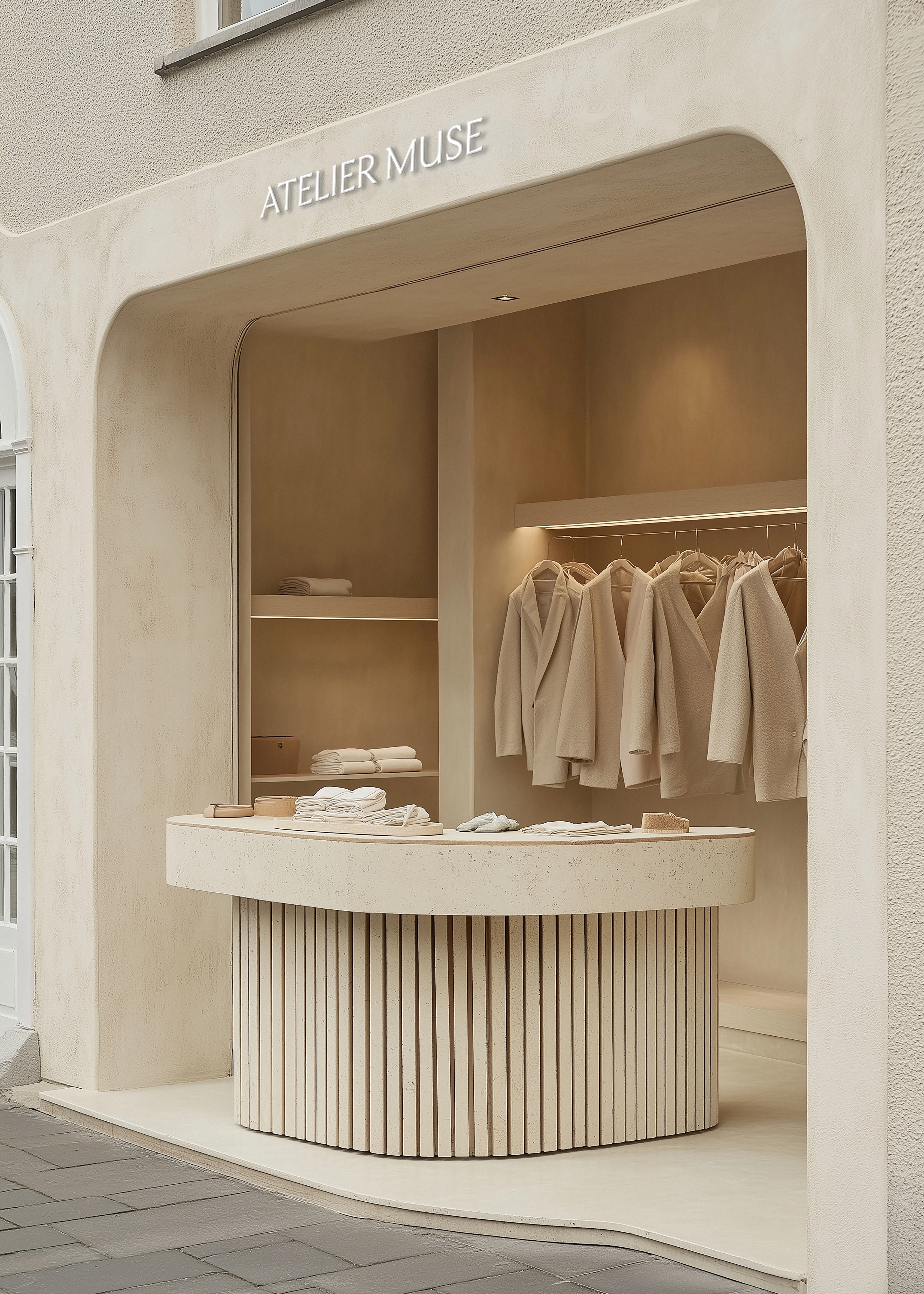 Transform your branding presentations with this minimalist pop-up retail space mockup. Set against a warm cream backdrop, this scene features delicate architectural details and soft natural lighting that elevates your designs. Perfect for lifestyle brands and boutique identities, the mockup includes customisable signage. Create an Instagram-worthy showcase that'll have clients imagining their brand in the heart of a fashion district.