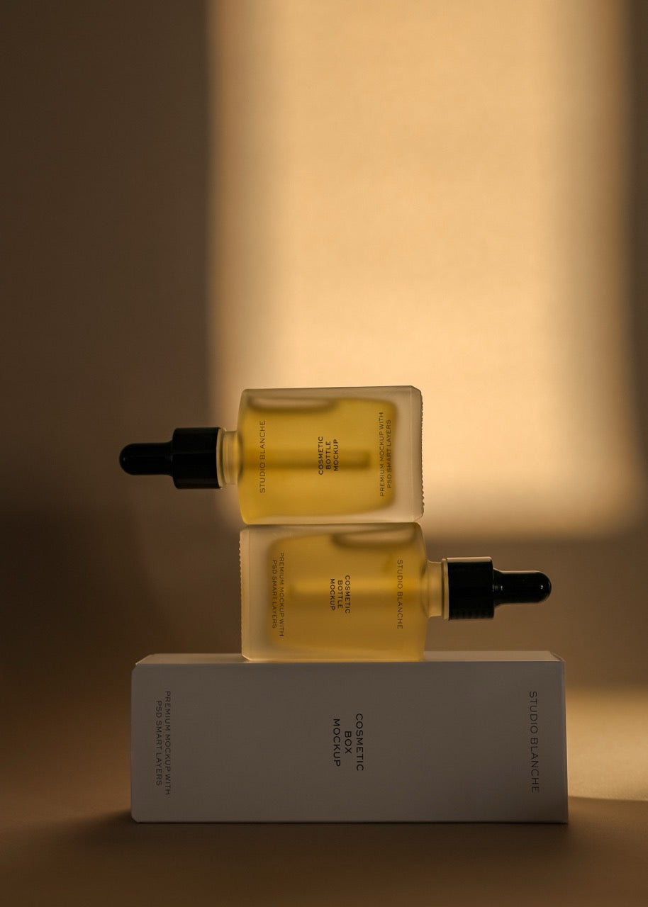 Unleash your creativity with the Soleil Collection’s premium Cosmetic Bottle Duo Mockup. Featuring two refined bottles resting on a chic box, this mockup is designed to showcase your beauty packaging designs in the most captivating way. Its radiant and elegant aesthetic makes it ideal for luxury skincare or cosmetic branding projects. With fully editable layers and true-to-life textures, you can customise every detail to perfection. Impress your audience and bring your designs to life with this essential mockup for beauty professionals.